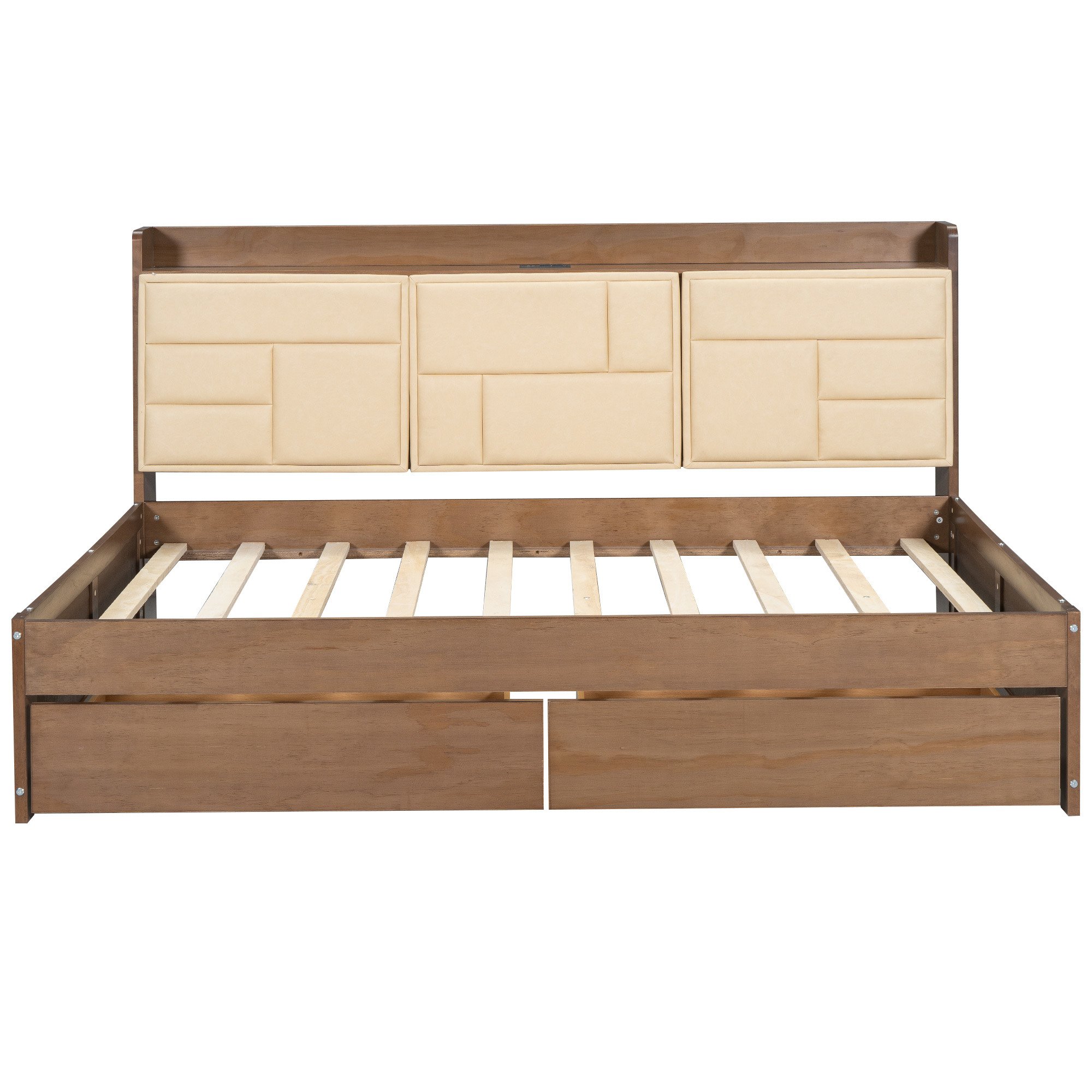Full Size Wood Daybed with Upholstered Storage Shelves, USB Ports and 2 Drawers, Wood Color